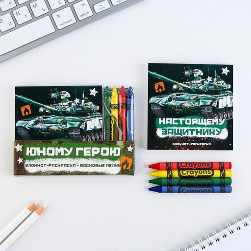 Цена за 2 шт. Подарочный набор: блокнот-раскраска и восковые мелки Юному герою