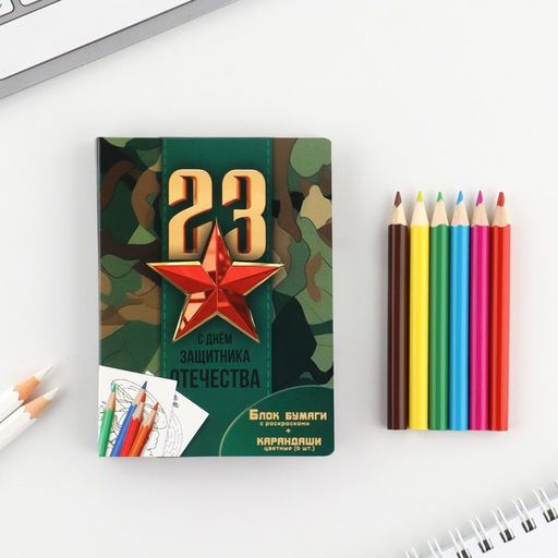 Подарочный набор 23 февраля, блок для записей с отрывными листами и заданиями, карандаши