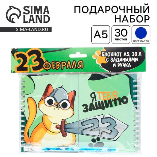 Подарочный набор, двойной блокнот на гребне с заданиями 15?12 см, 30 л. и ручка 23 февраля: Я тебя защитю