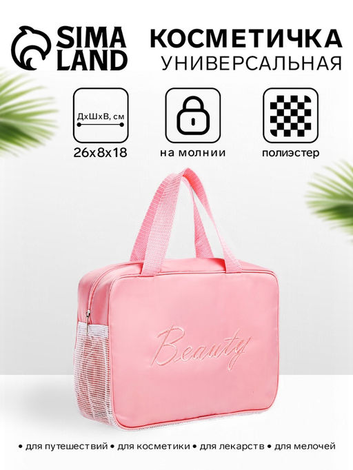 Косметичка - сумочка на молнии с сеткой, с ручками, с вышивкой, розовая