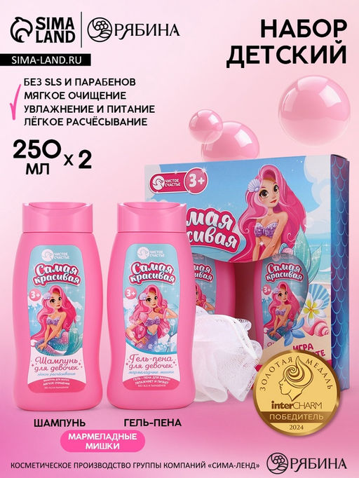 Набор детский Самая красивая, гель-пена 250 мл, шампунь 250 мл, мочалка 25 г, Чистое счастье