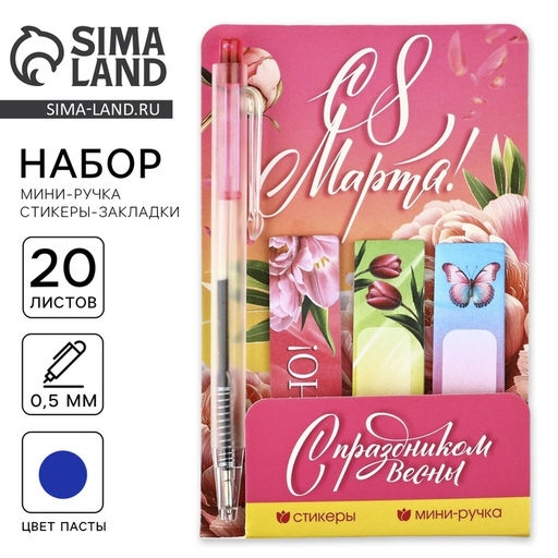 Цена за 3 шт. Подарочный набор С 8 Марта, мини ручка и стикеры-закладки 20 л