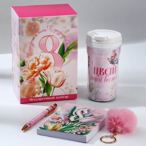 Подарочный набор: термостакан, ежедневник А6, 120 л., брелок, ручка 8 марта