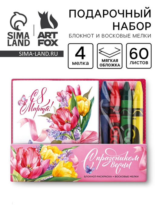 Цена за 2 шт. Подарочный набор С 8 Марта, блокнот-раскраска и восковые мелки