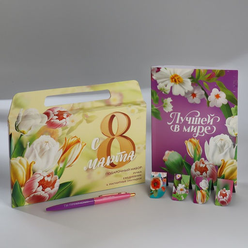 Подарочный набор в портфеле: ежедневник А5, магнитные закладки и ручка 8 марта