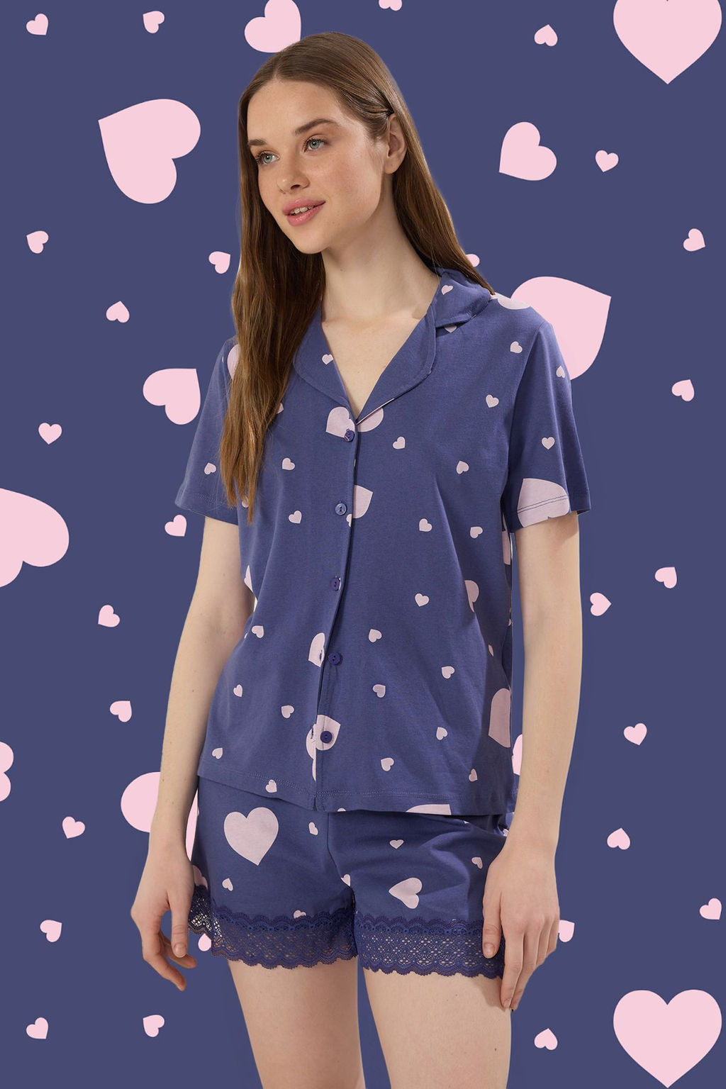 Mavi %100 Pamuklu Kalpli Dantel Detayl? Sortlu Orme Pijama Tak?m? THMSS25PT00302