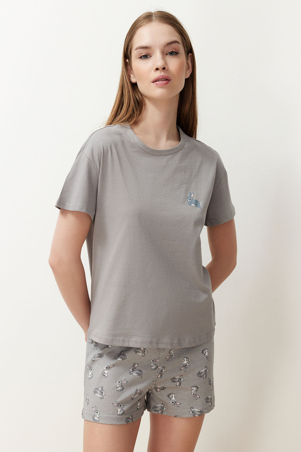 Gri %100 Pamuklu Tavsan Desenli Sortlu Orme Pijama Tak?m? THMSS24PT00199