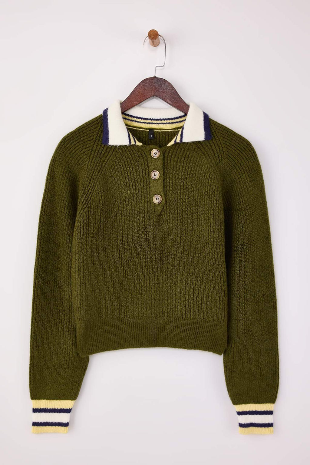 Haki Yumusak Dokulu Renk Bloklu Triko Kazak TWOAW26KZ00285