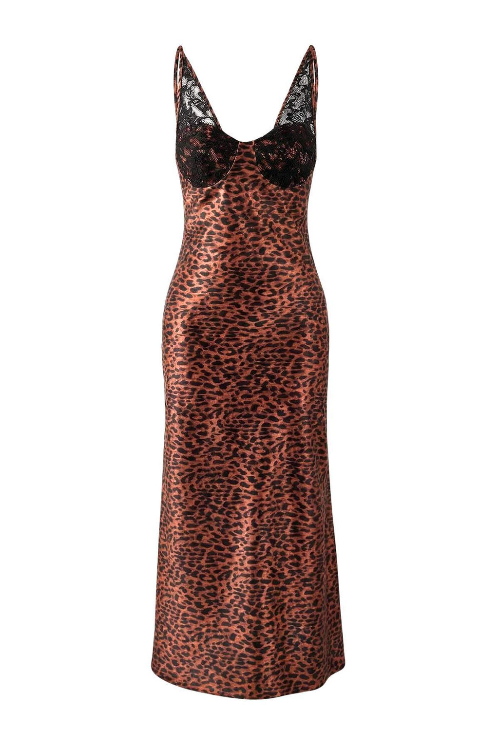Kahverengi Animal Dantel Detayl? Dokuma Saten Midi Astars?z S?k/Gece Elbise
