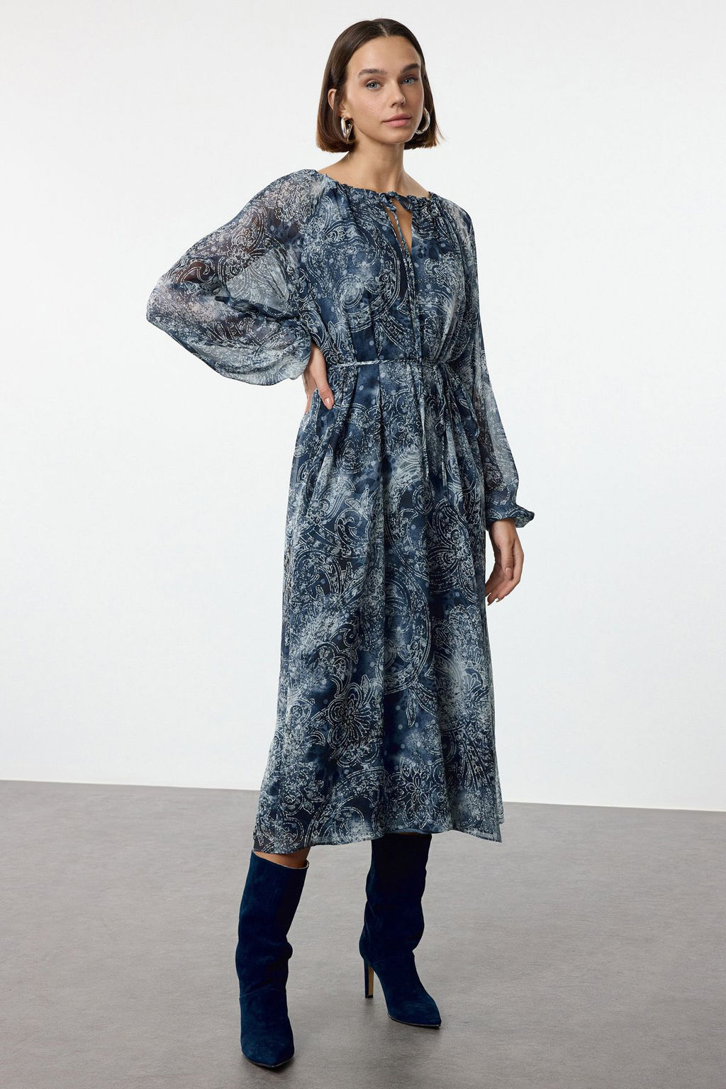Lacivert Kusakl? Cicekli A Kesim Midi Astarl? Dokuma K?sl?k Elbise TWOAW25EL00498
