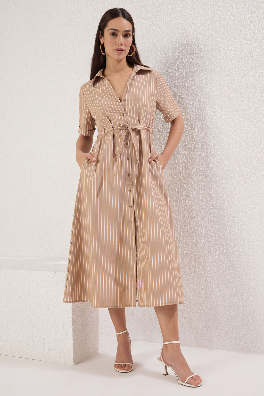 Kahverengi Kemerli Cizgili A Kesim Midi Dokuma Elbise TWOSS25EL00647