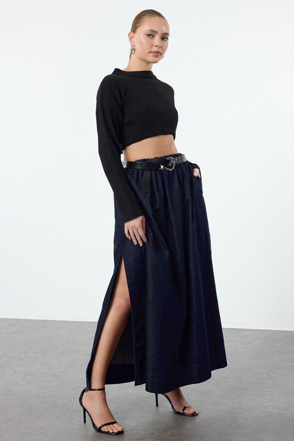 Lacivert Y?rtmacl? Beli Lastikli Yuksek Bel Maxi Denim Balon Etek TWOAW25ET00100