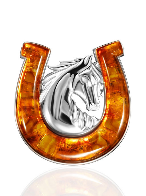 Брошь с символом 2026 года Подкова, украшенная янтарём