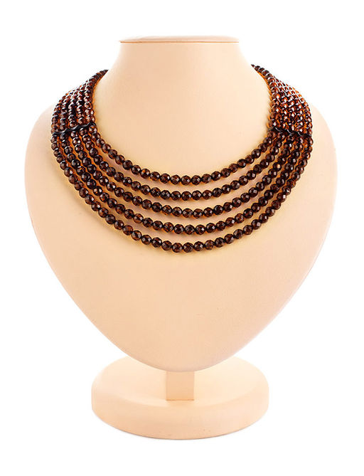 Пятирядное колье из натурального янтаря Карамель тёмно-коньячная алмазная