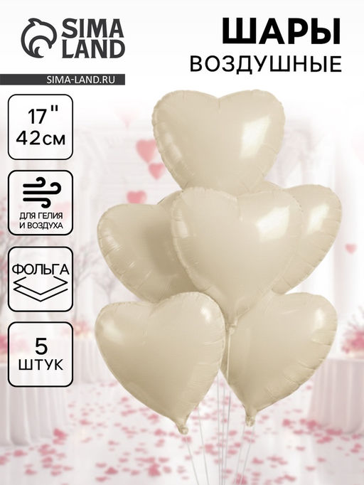 Цена за 2 шт.Воздушные шары фольгированные 17" Сердце, молочный сатин, набор 5 шт.