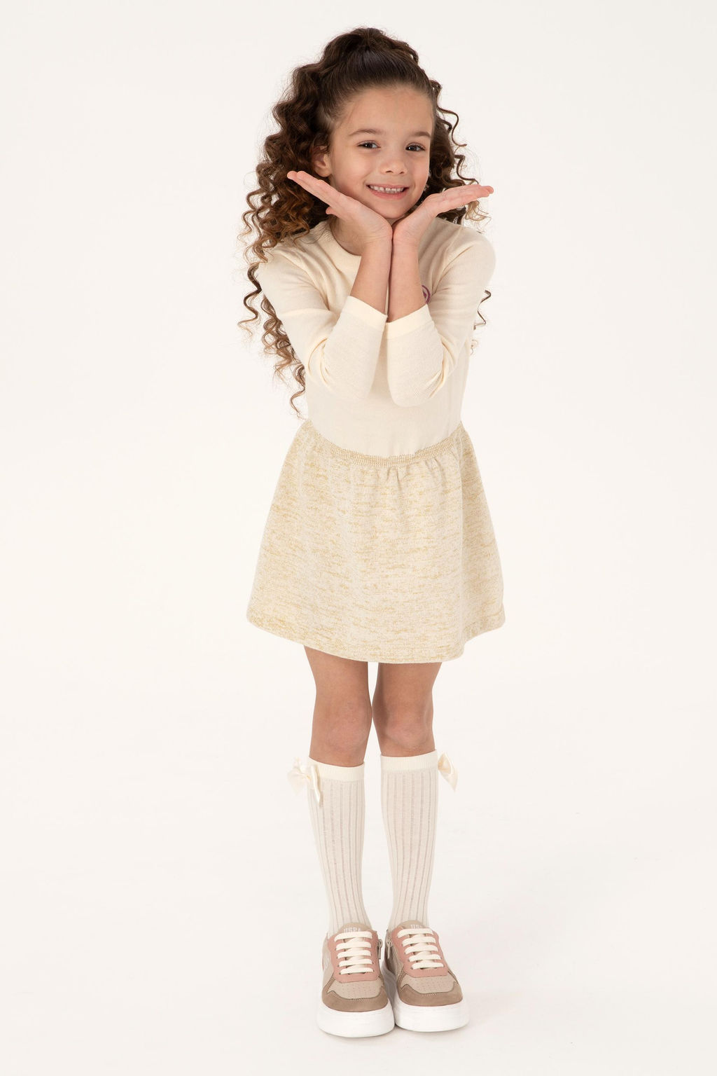 K_z _ocuk Krem Melanj Triko Elbise