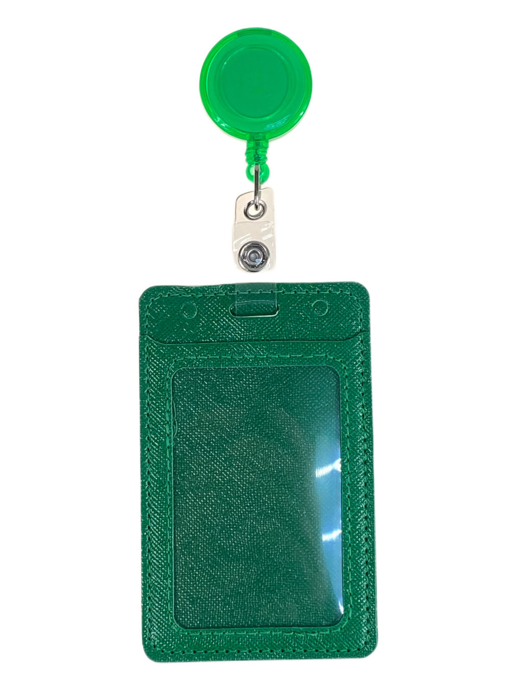 Бейдж с лентой на рулетке вертикальный, цвет зеленый