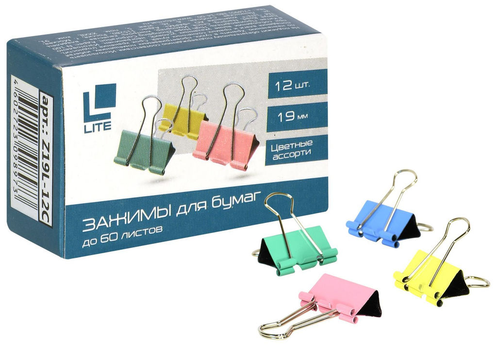 Цена за 10 шт. Зажим для бумаг LITE 19 мм ассорти, металл, 1 шт