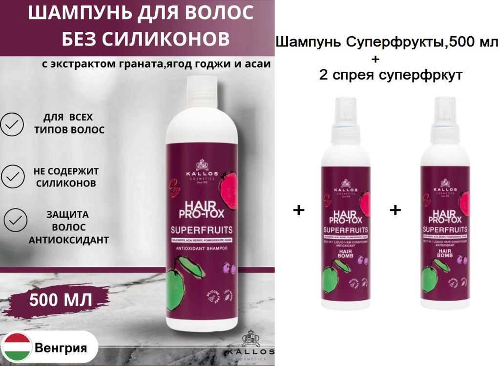 Шампунь Суперфрукты БЕЗ силиконов 500 мл + 2 спрея суперфркут.