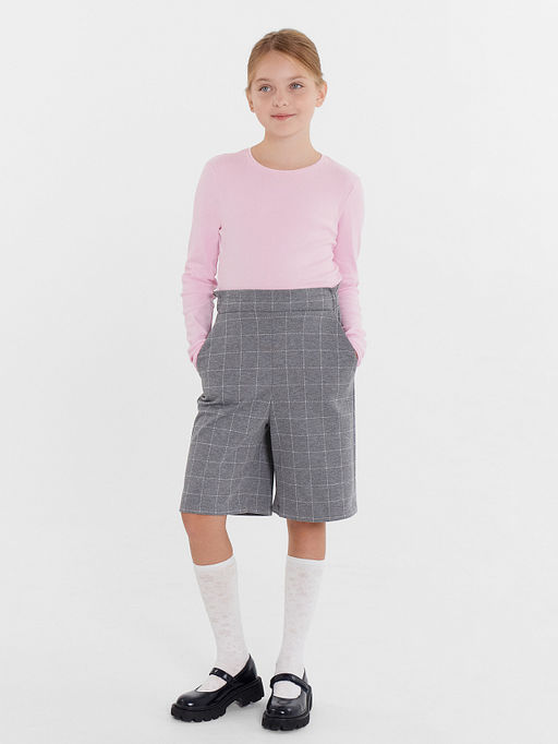 Прямые серые шорты в крупную клетку с рюшей на поясе для девочек