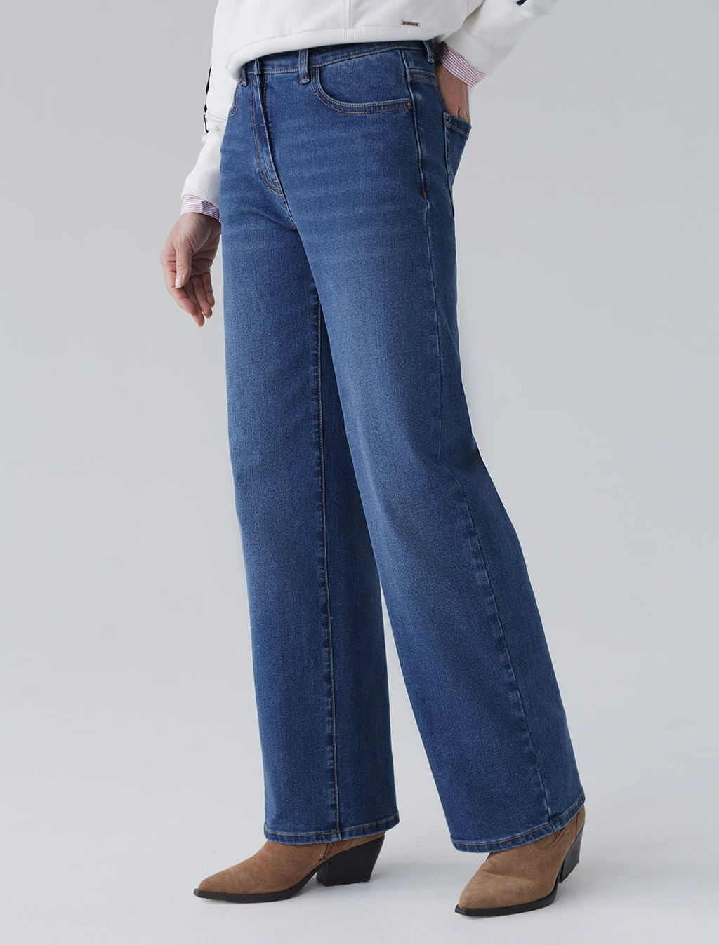 Джинсы трубы с декоративной стиркой из эластичного облегченного денима