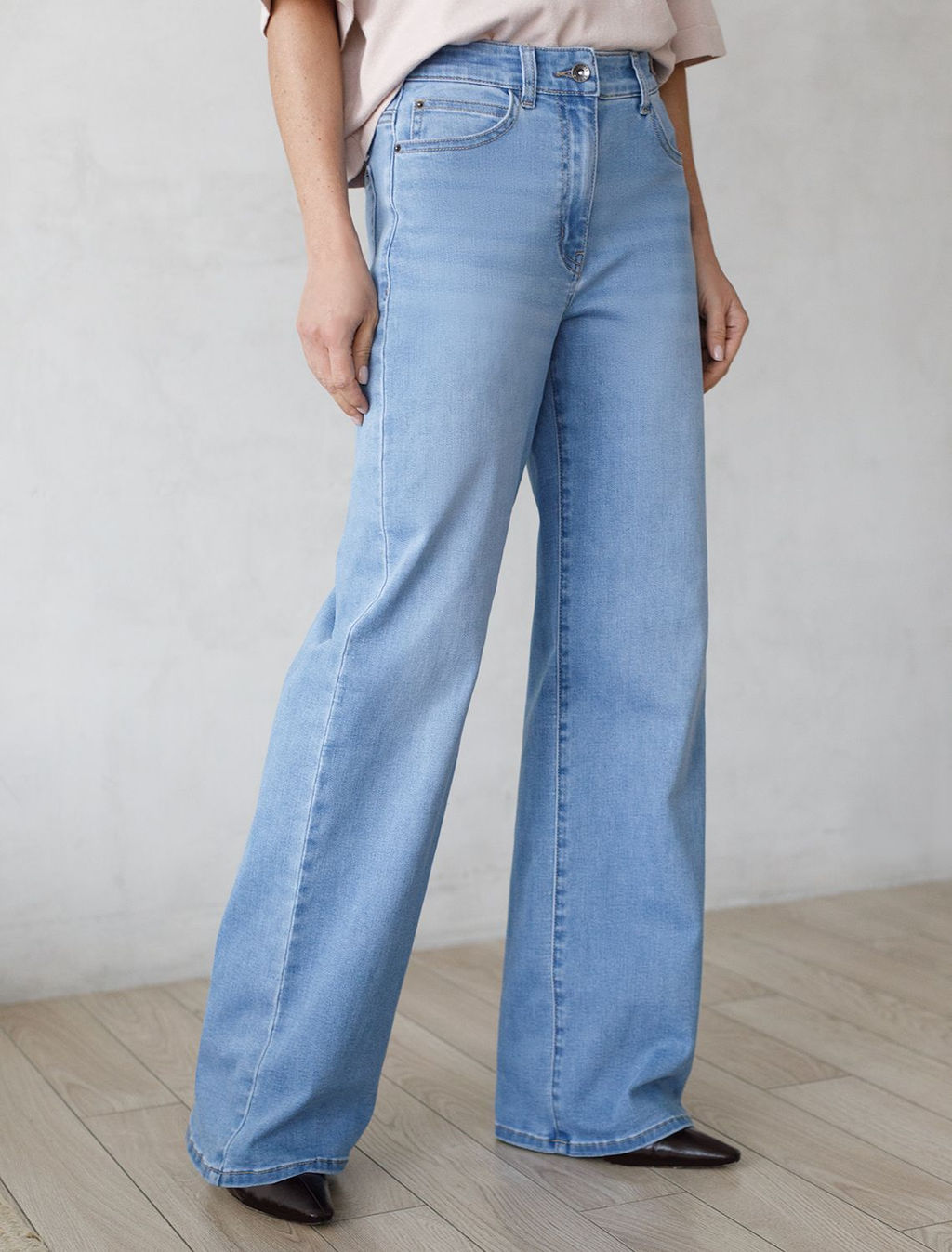 Джинсы трубы с декоративной стиркой из эластичного облегченного денима