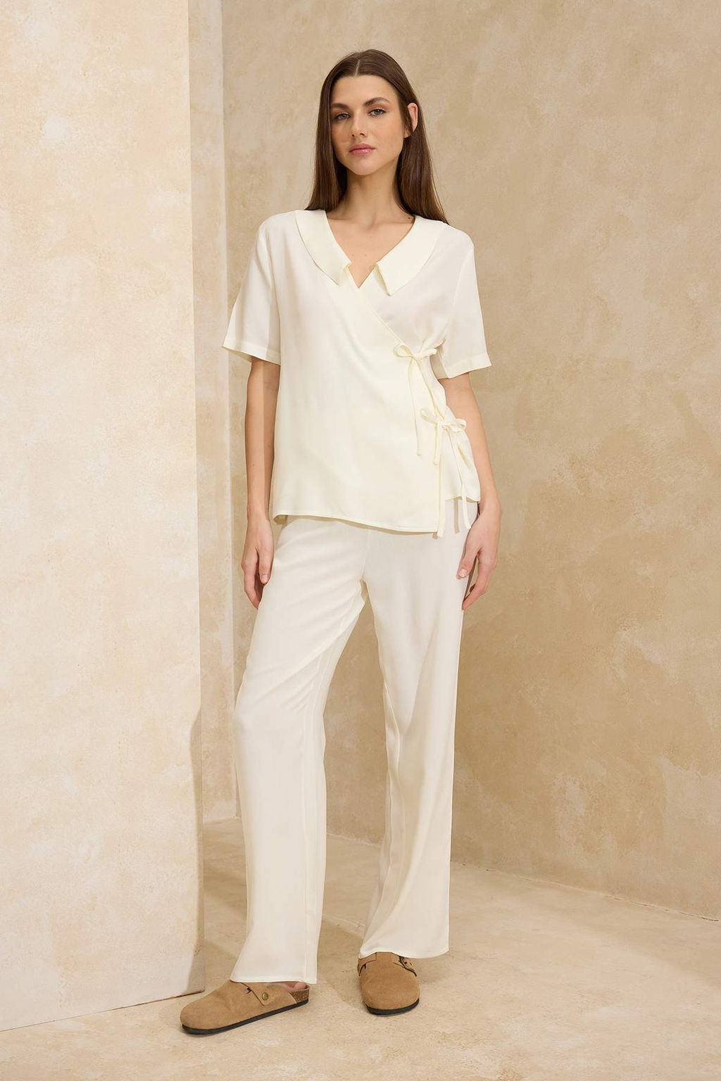 Ekru Duz Shally Dokuma Pijama Tak?m? THMSS26PT00029