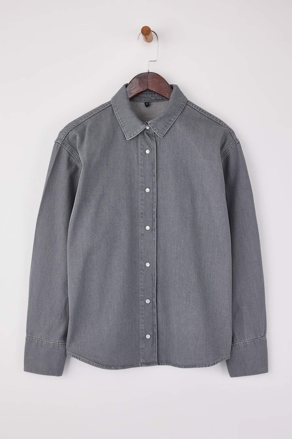 Gri Oversize Basic 100% Pamuk Denim Gomlek TWOSS26GO00005