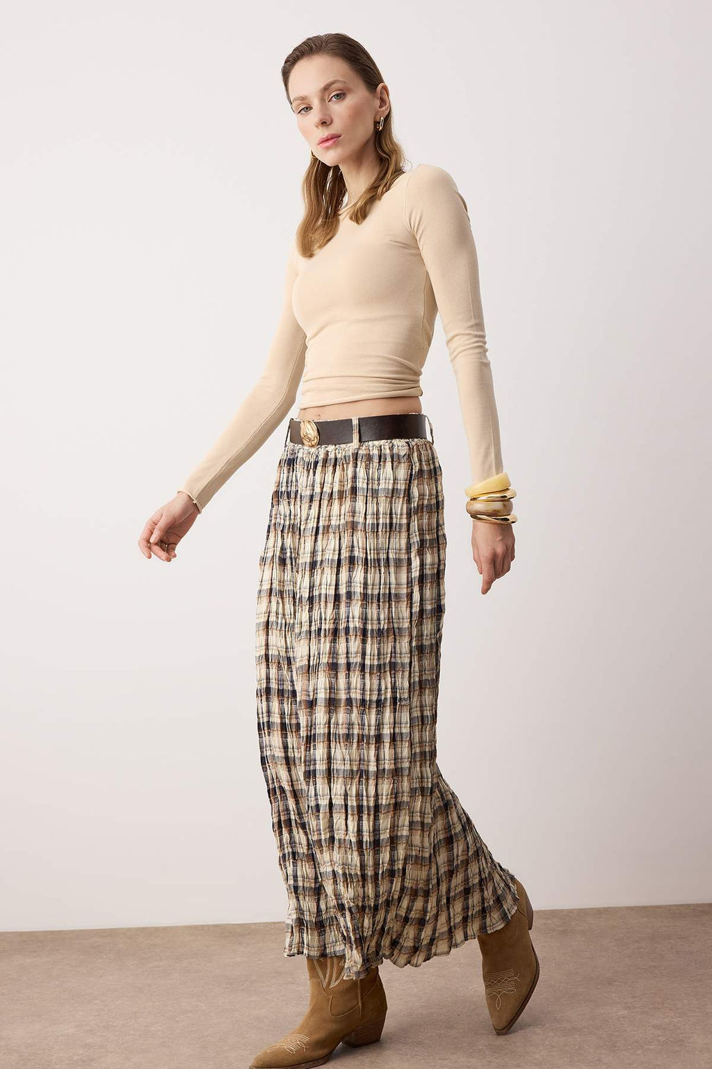 Cok Renkli Ekoseli Kemerli K?r?s?k Dokuma Uzun Maxi Etek TWOAW26ET00174