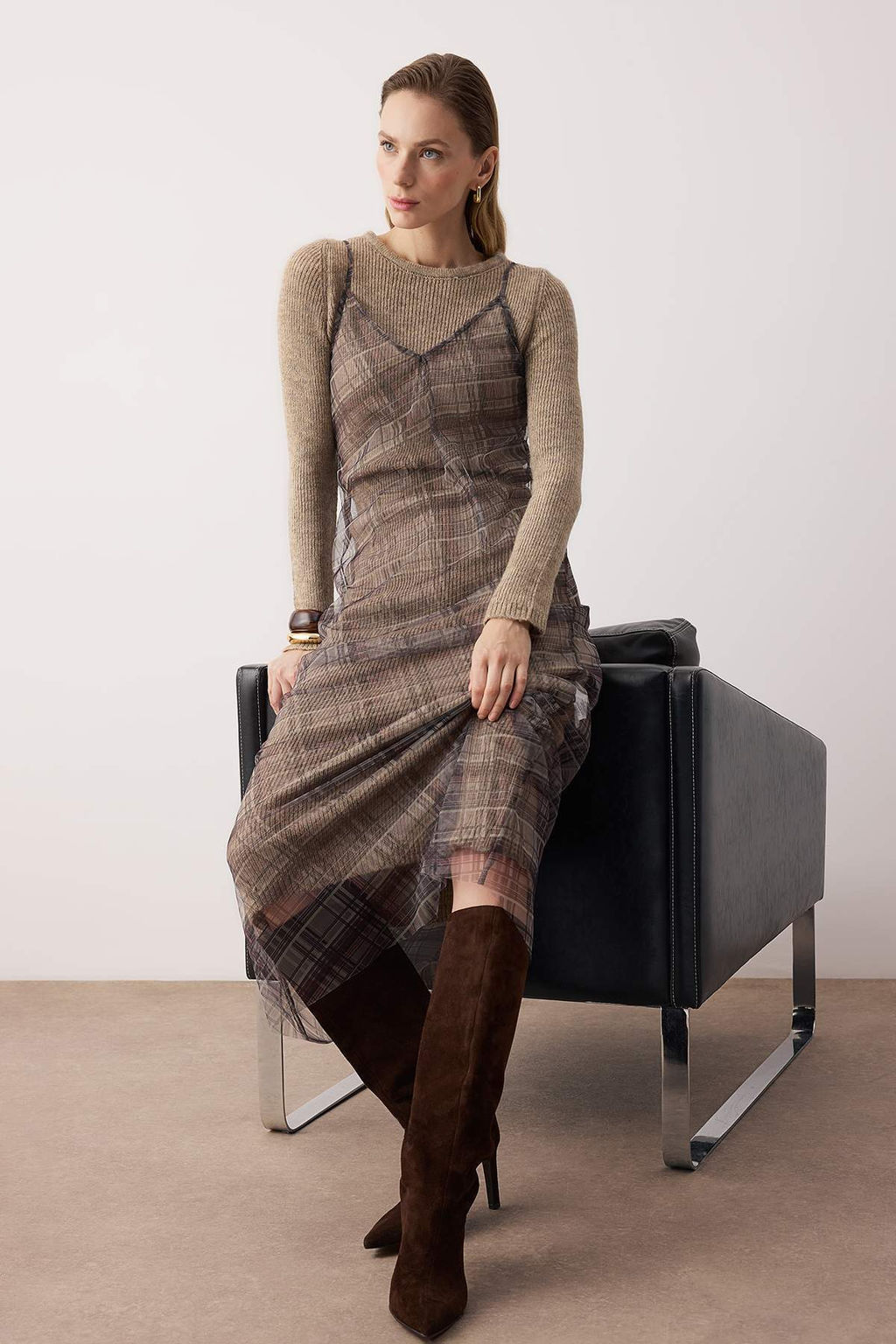 Bej Maxi Ekose Detayl? 2li Dokuma Triko Elbise TWOAW26EL00379