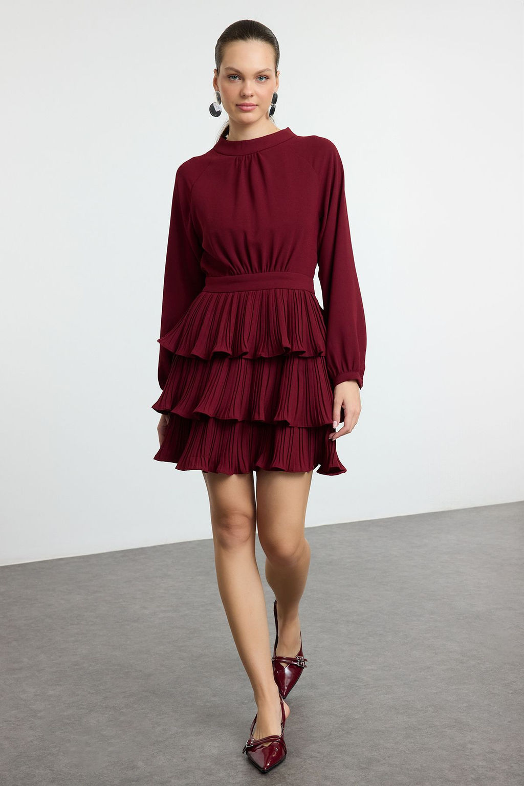 Bordo Skater/Belden Ac?lan Piliseli Dik Yaka Mini Dokuma Elbise TWOAW25EL00253