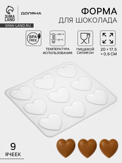 Форма для шоколада Доляна Сердечки, силикон, 20?17.5?0.6 см, 9 ячеек (5.5?5 см), прозрачная