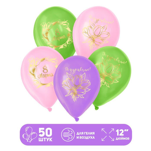 Воздушные шары латексные 12" 8 Марта, 50 шт.