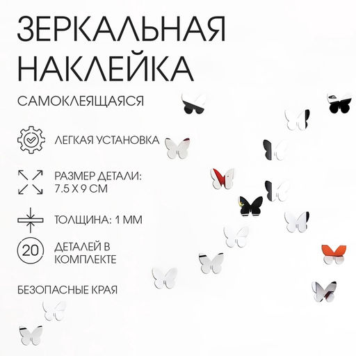 Зеркало настенное Бабочки, на клеевой основе, акриловое, 20 шт. 7.5?9 см