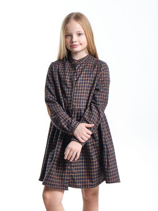 Платье для девочки в клетку с заплатками на рукавах UD 7863 син-горчица клетка
