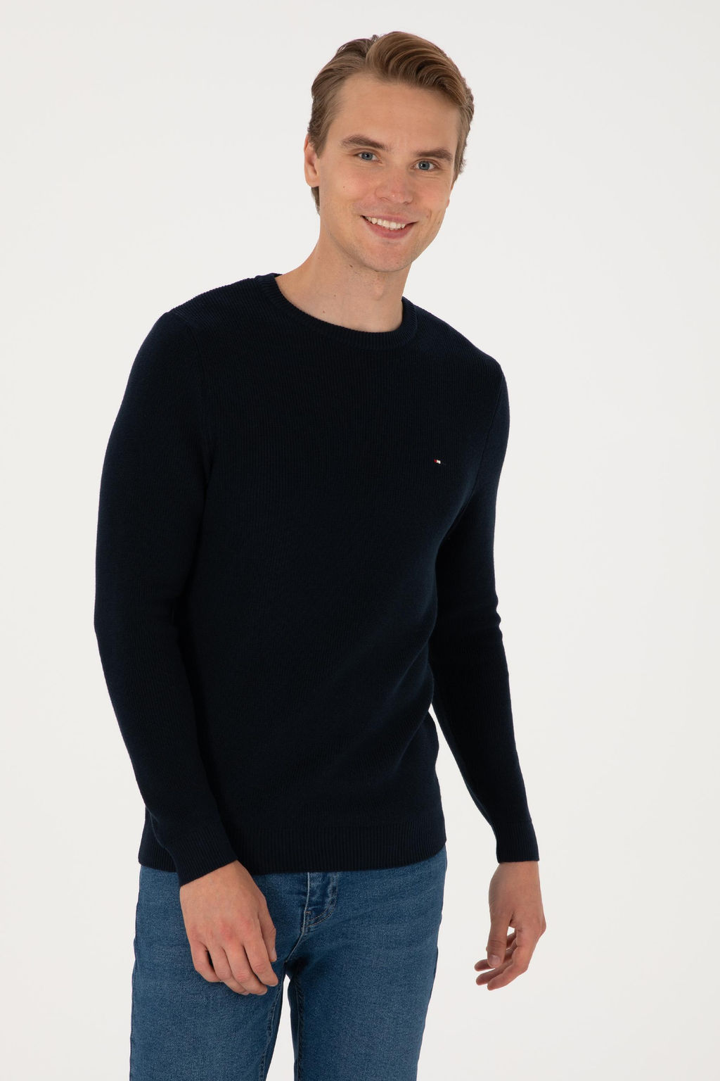 Erkek Slim Fit Bisiklet Yaka Lacivert Basic Kazak