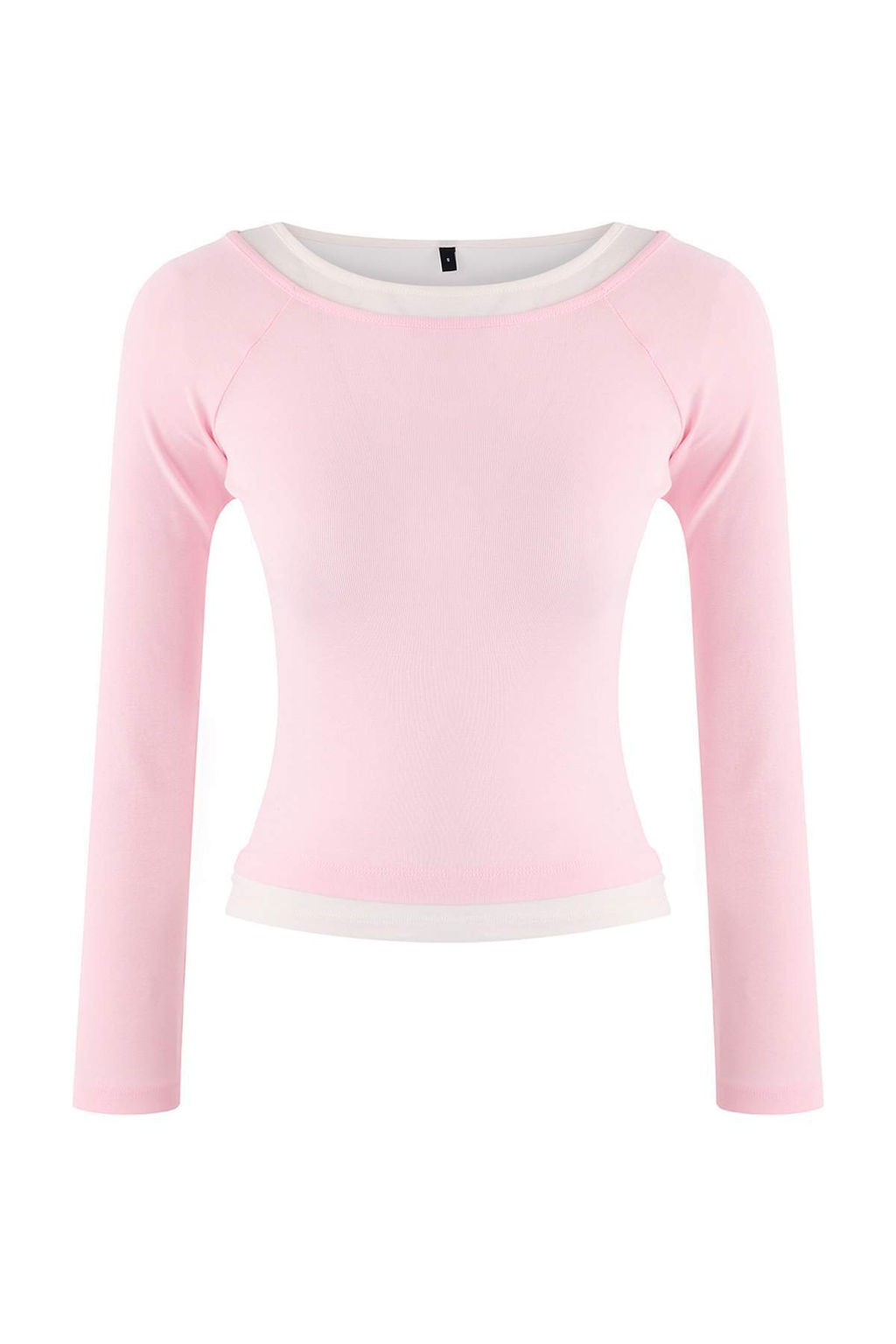 Pembe Vucuda Oturan Cift Gorunumlu Kay?k Yaka Uzun Kollu Pamuk Ribana Orme Bluz TWOSS26BZ00230