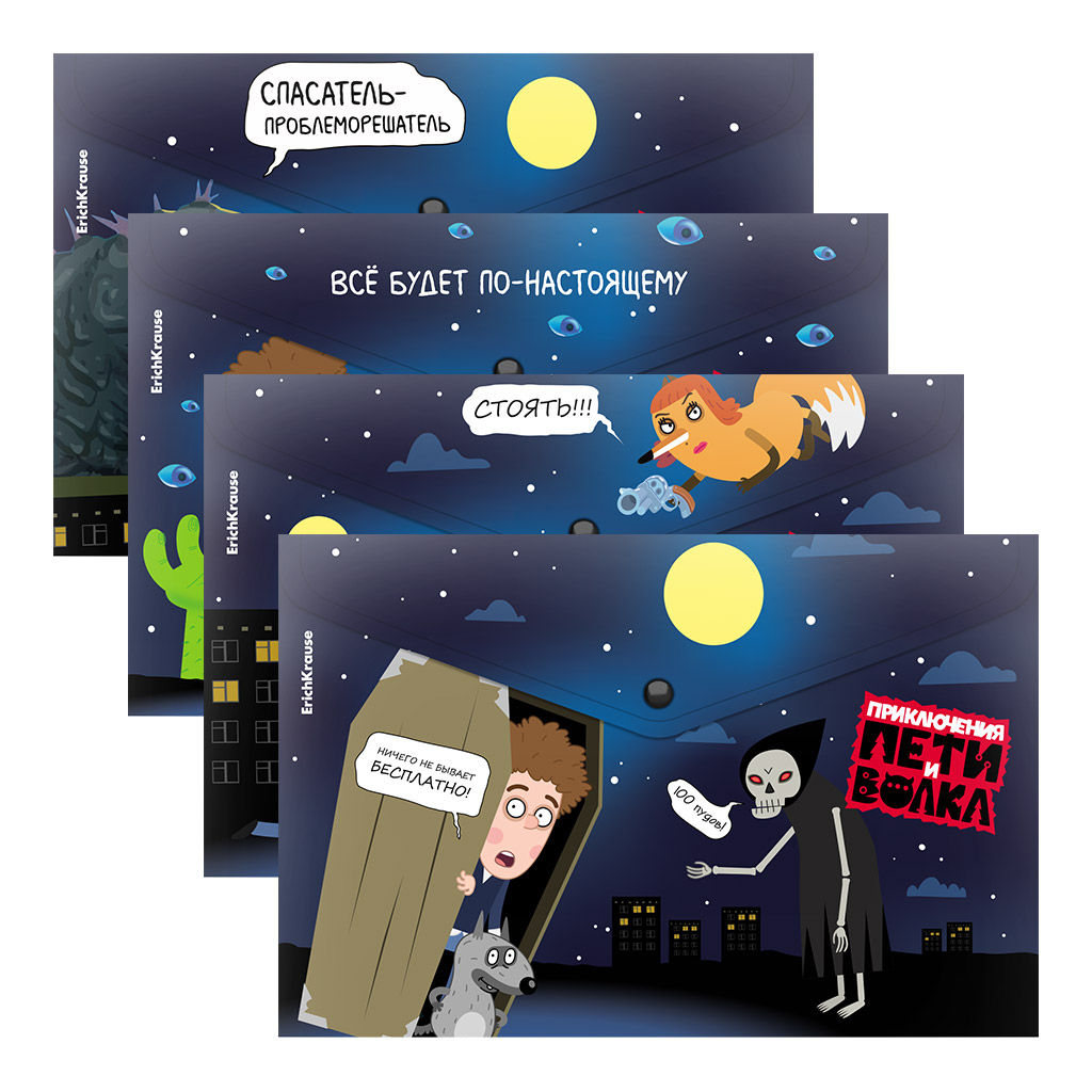 АКЦИЯ СТОК Цена за 12 шт. Папка-конверт на кнопке пластиковая ErichKrause Приключения Пети и Волка, A4, ассорти (в пакете по 12 шт.)