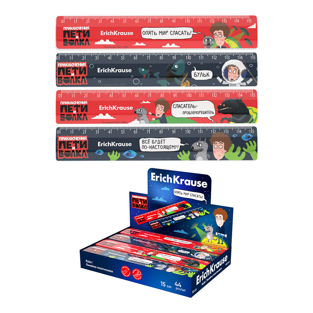 АКЦИЯ СТОК Цена за 44 шт. Линейка пластиковая ErichKrause Приключения Пети и Волка, 15см, ассорти (в коробке-дисплее по 44 шт)