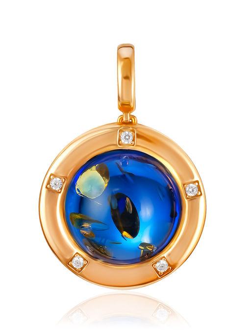 Круглый позолоченный кулон с тонированным голубым янтарём и фианитами Ампир