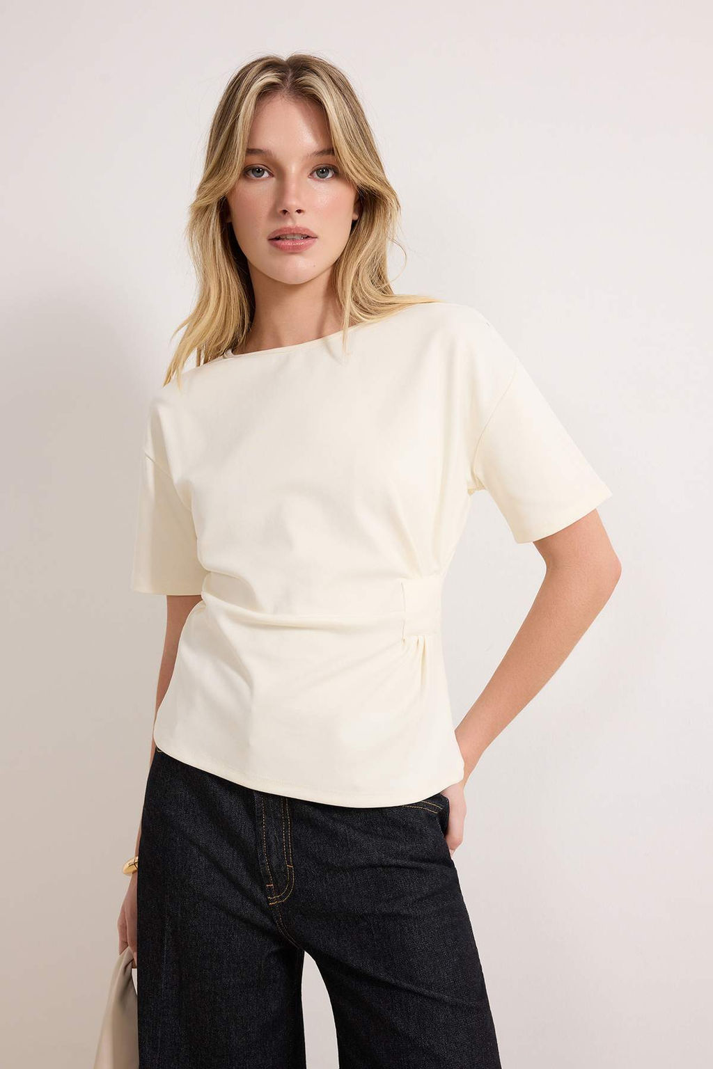 Ekru Fitted/Vucuda Oturan Kay?k Yaka Dusuk Kol K?sa Kollu Interlok Orme Bluz TWOSS26BZ00193