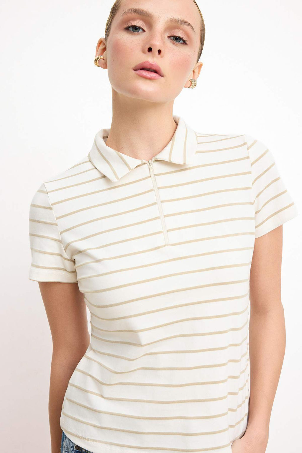 Ekru Cizgili Normal Kal?p Polo Yaka Fermuarl? Crop Yumusak Orme Bluz TWOSS26TS00025