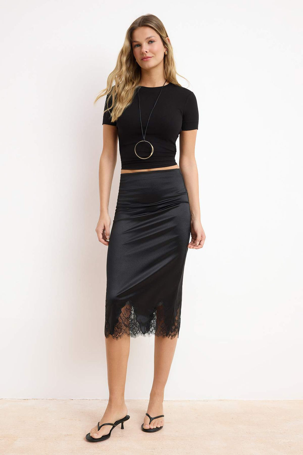 Siyah Bal?k Beli Lastikli Dantel Detayl? Normal Bel Midi Saten Orme Etek TWOSS26ET00047