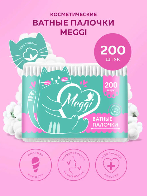 Ватные палочки "Meggi" 200 шт. (пакет), MEGCB 00200