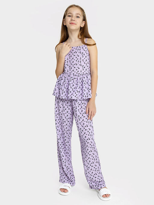Комплект для девочки (топ, брюки) в фиолетовом цвете с рисунком цветов