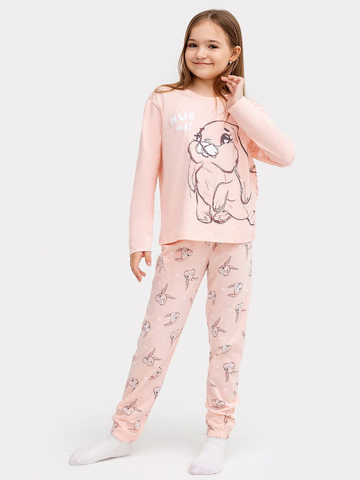 Комплект для девочек (джемпер, брюки) светло-коралловый с принтом "зайки"