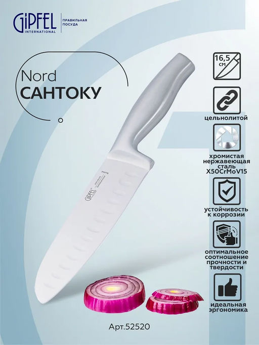 52520 GIPFEL Нож поварской сантоку NORD 16,5 см. Материал лезвия: хромистая нержавеющая сталь X50CrMoV15. Материал ручки: нержавеющая сталь. Толщина: 1,8мм