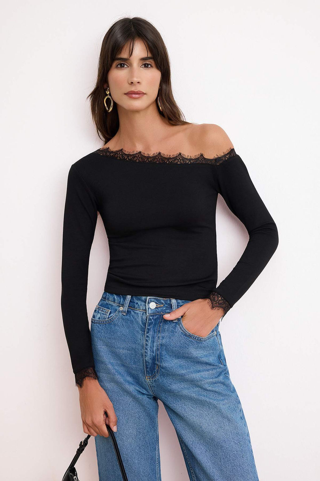 Siyah Fitted/Vucuda Oturan Asimetrik Yaka Uzun Kollu Dantel Detayl? Tul Orme Bluz TWOSS26BZ00662