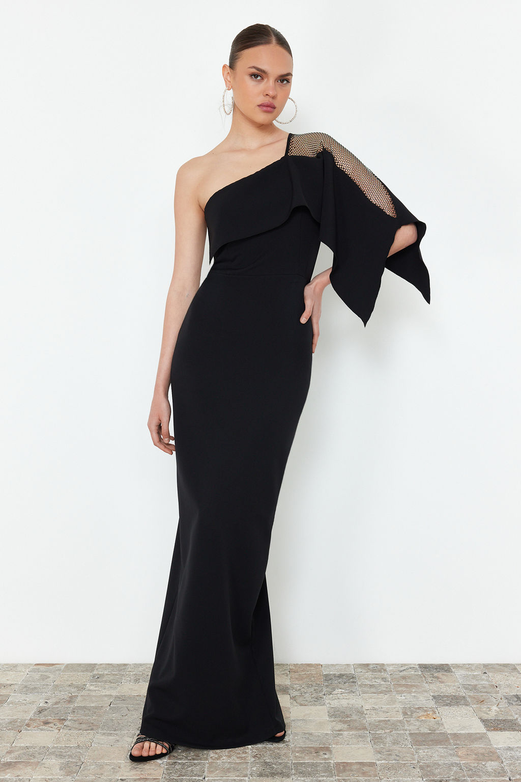 Siyah Vucuda Oturan Tas Aksesuarl? Tek Kol Dokuma Uzun Abiye Elbise TPRSS24AE00132