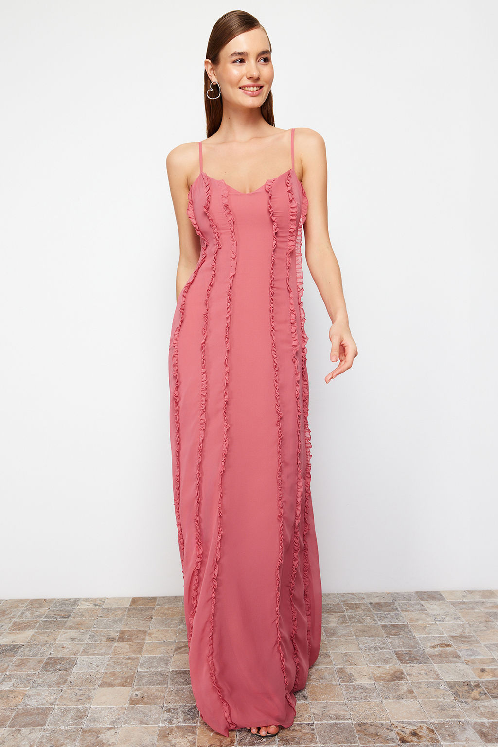 Gul Kurusu Dokuma Sifon Uzun Gece Abiye Elbise TPRSS24AE00072